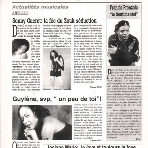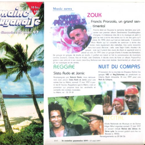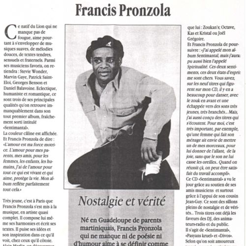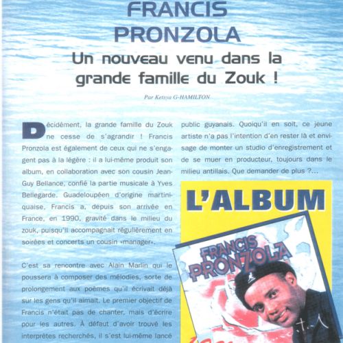 Né en GUADELOUPE, Francis PRONZOLA s’intéresse très tôt à la musique. Il se met à écrire des textes sur la vie des gens qu’il côtoie.